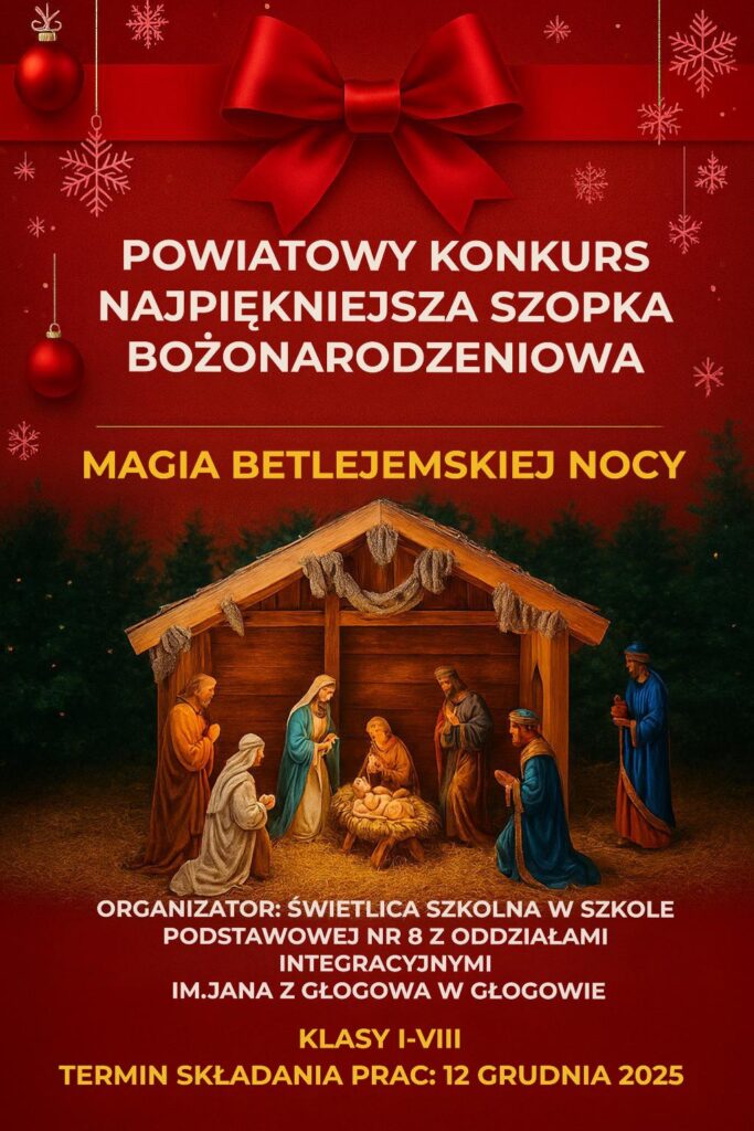 Szkoła Podstawowa nr 8 z Oddziałami Integracyjnymi im. Jana z Głogowa w Głogowie przesyła poprawny regulamin: Powiatowy Konkurs Najpiękniejszej Szopki Bożonarodzeniowej „ Magia Betlejemskiej Nocy”.