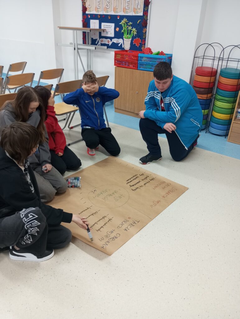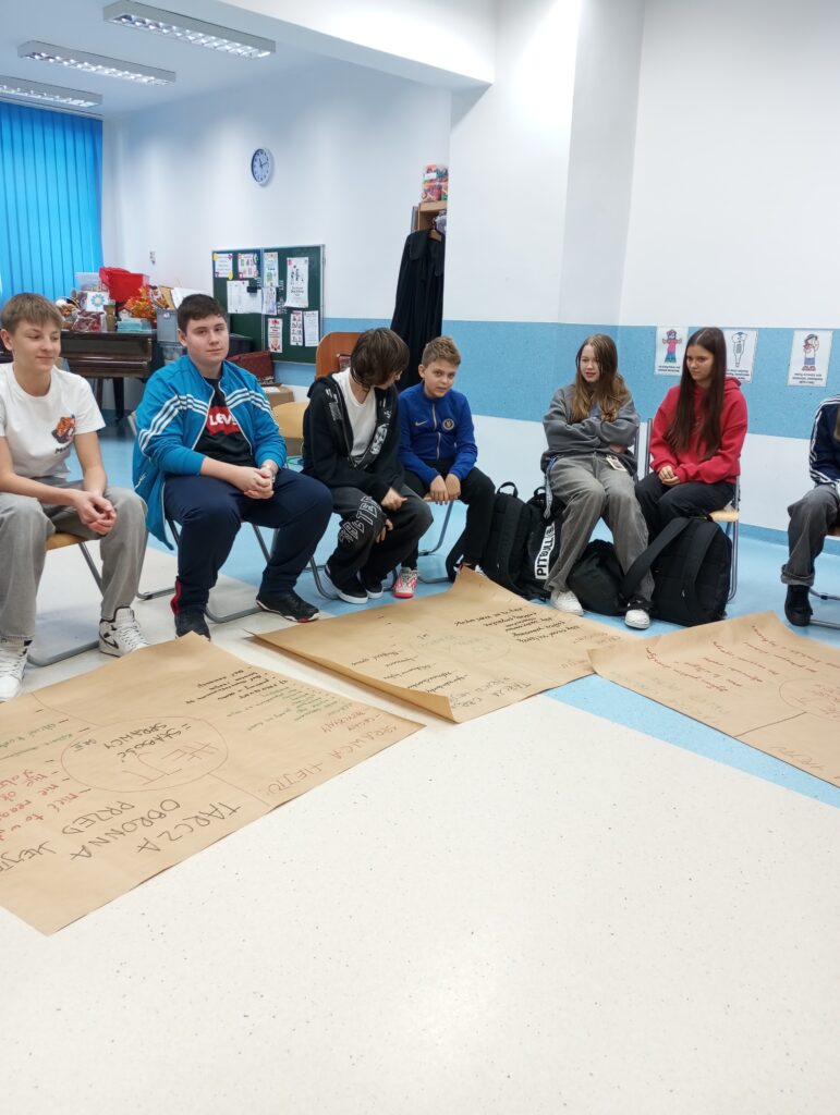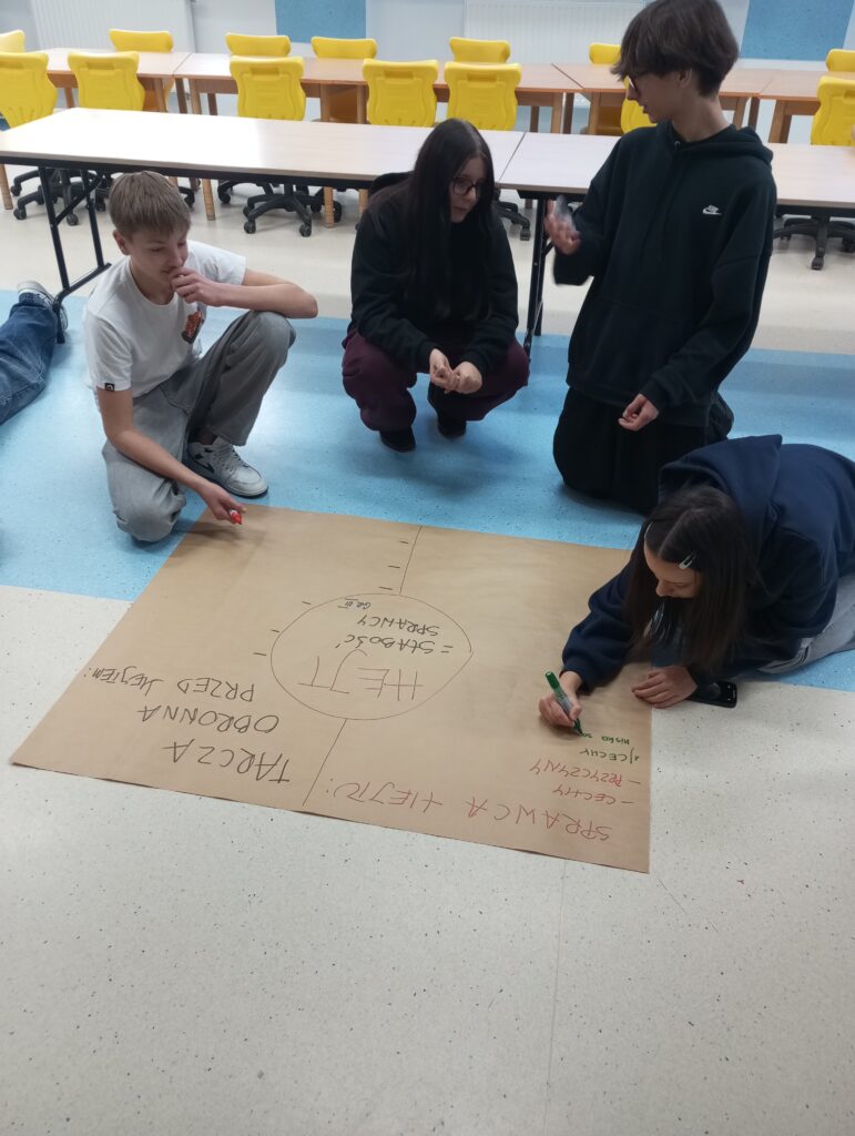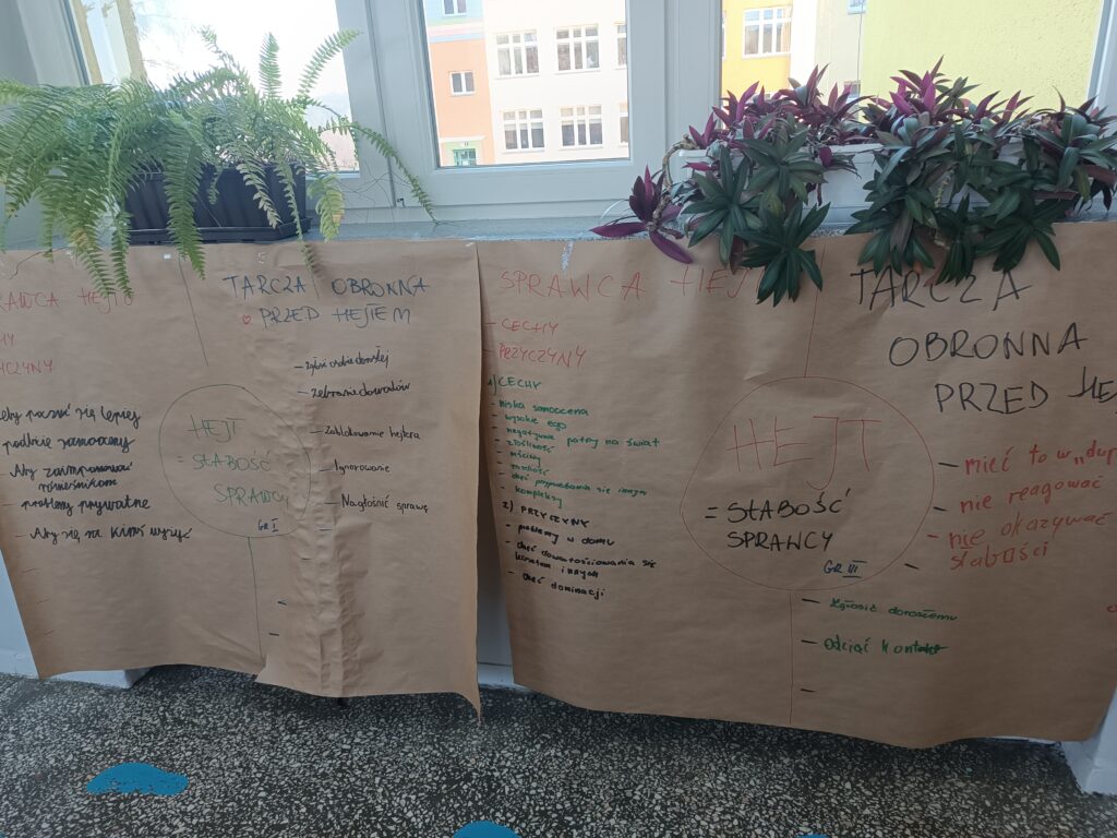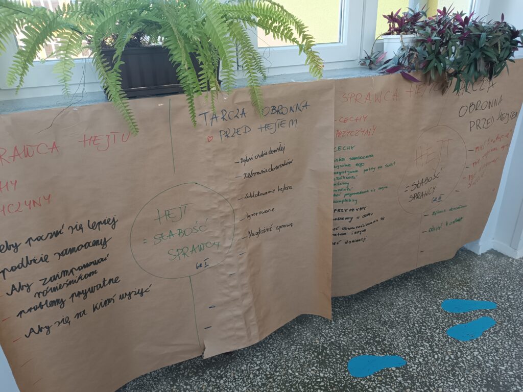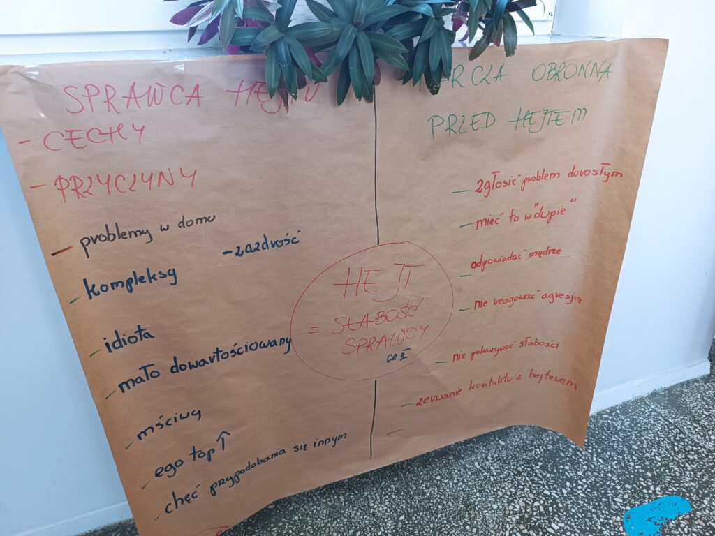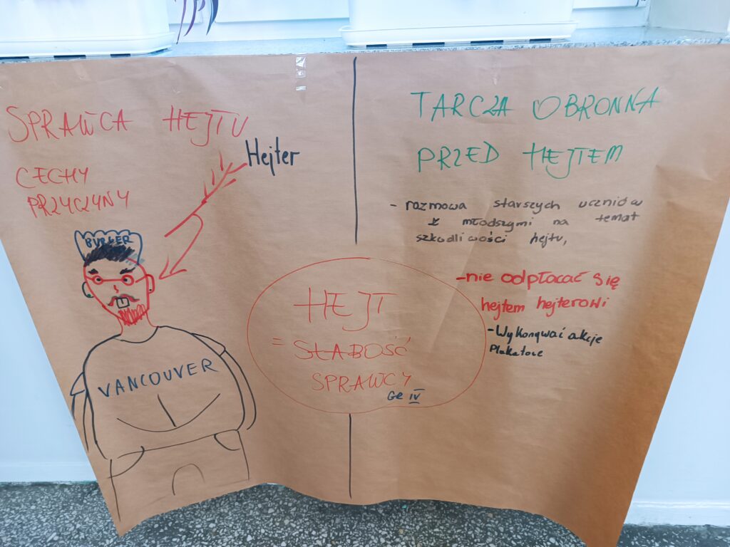 Następnie uczniowie, podzieleni na grupy, dyskutowali nad sprawcą hejtu, jaki jest, czym się kieruje oraz nad tarcza ochronną