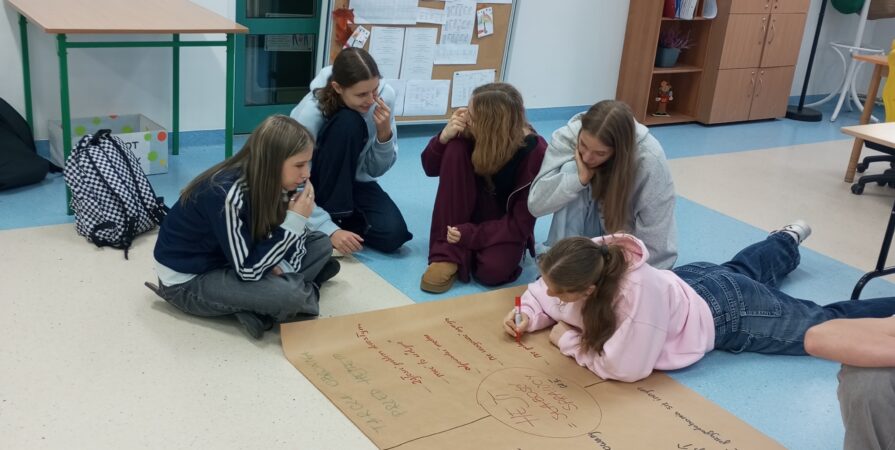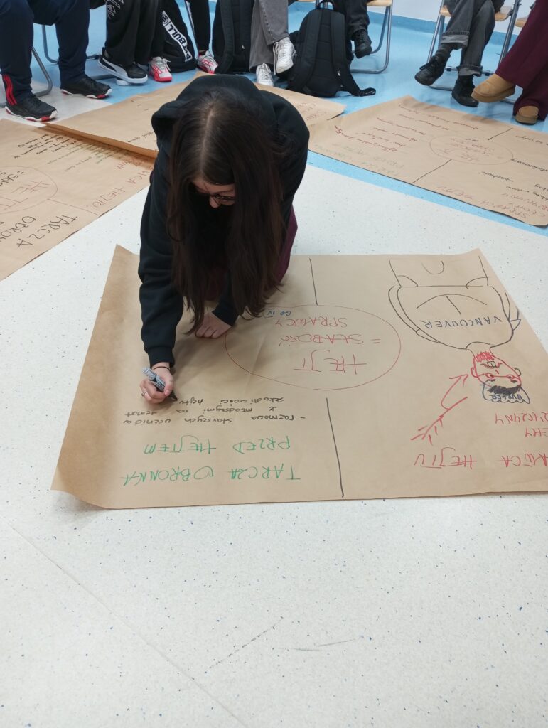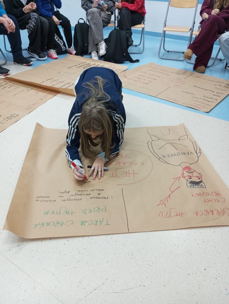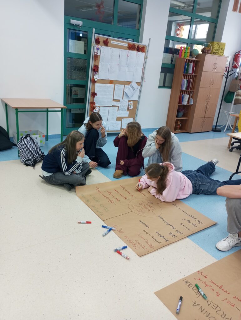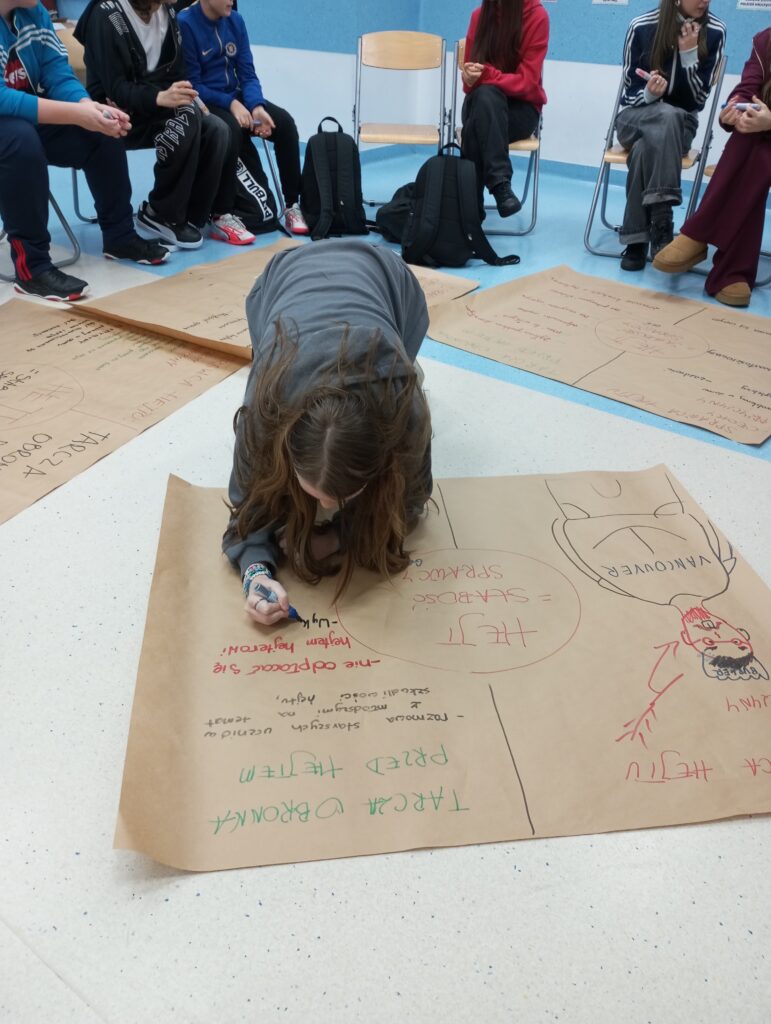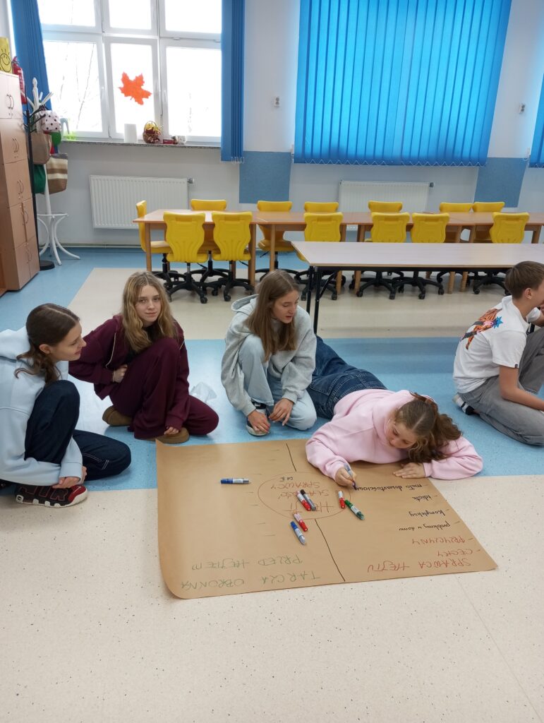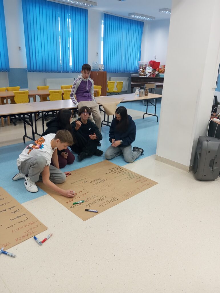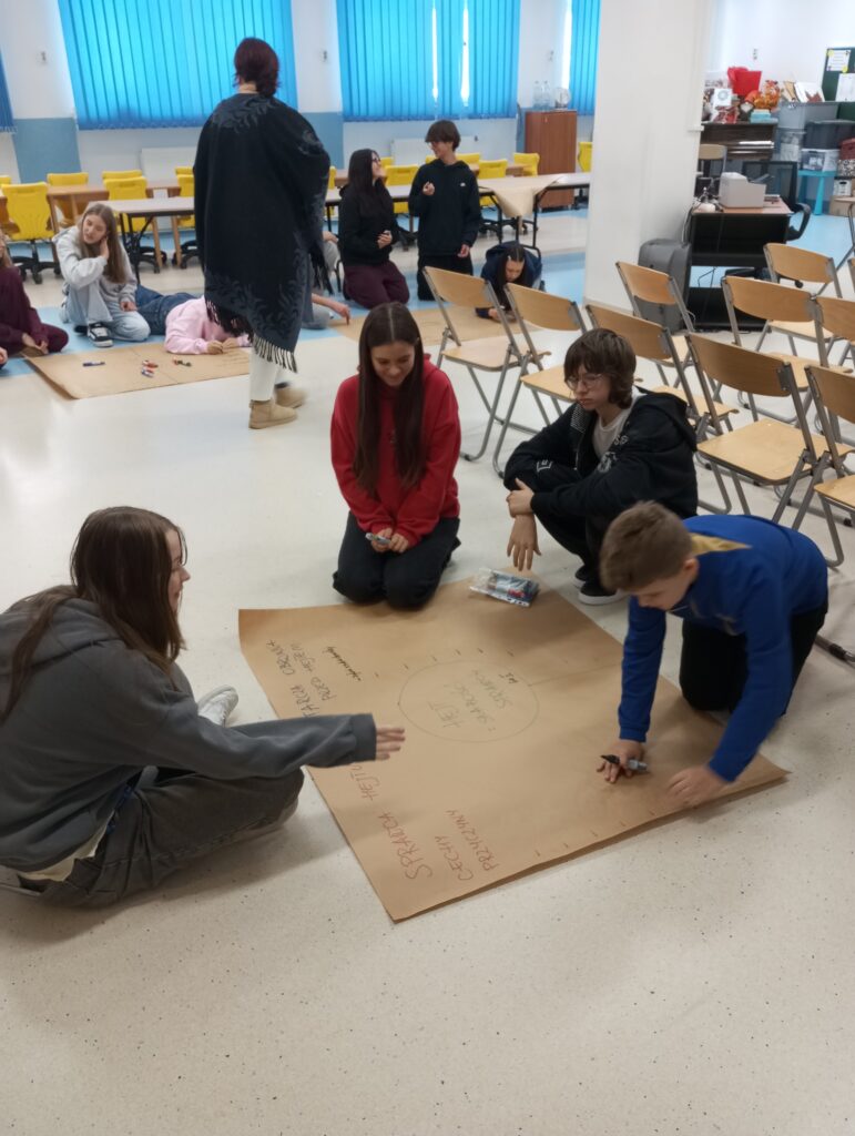 Następnie uczniowie, podzieleni na grupy, dyskutowali nad sprawcą hejtu, jaki jest, czym się kieruje oraz nad tarcza ochronną