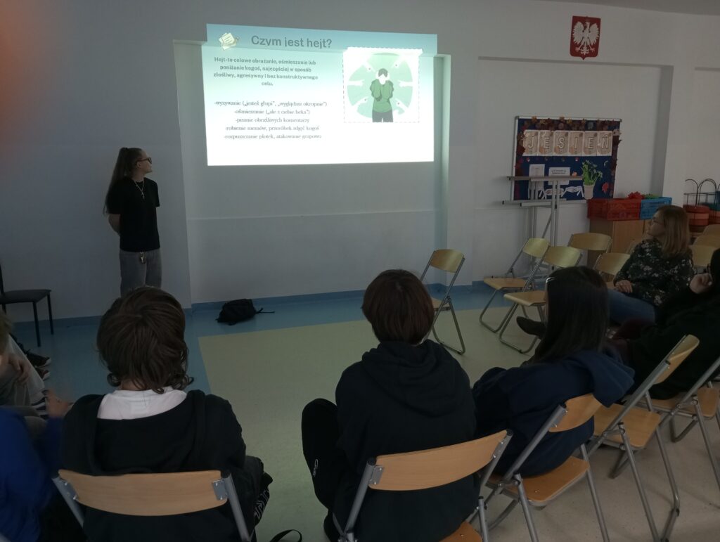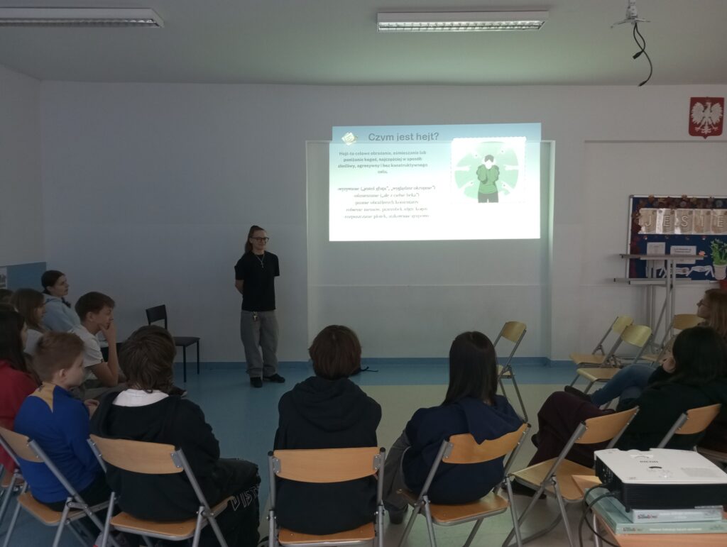 Premiera prezentacji „Hejt w szkole” miała miejsce wcześniej w klasach 4-6 za sprawą Przewodniczącej SU i Rzecznika SU Hani Burgchardt i Mai Biedal.