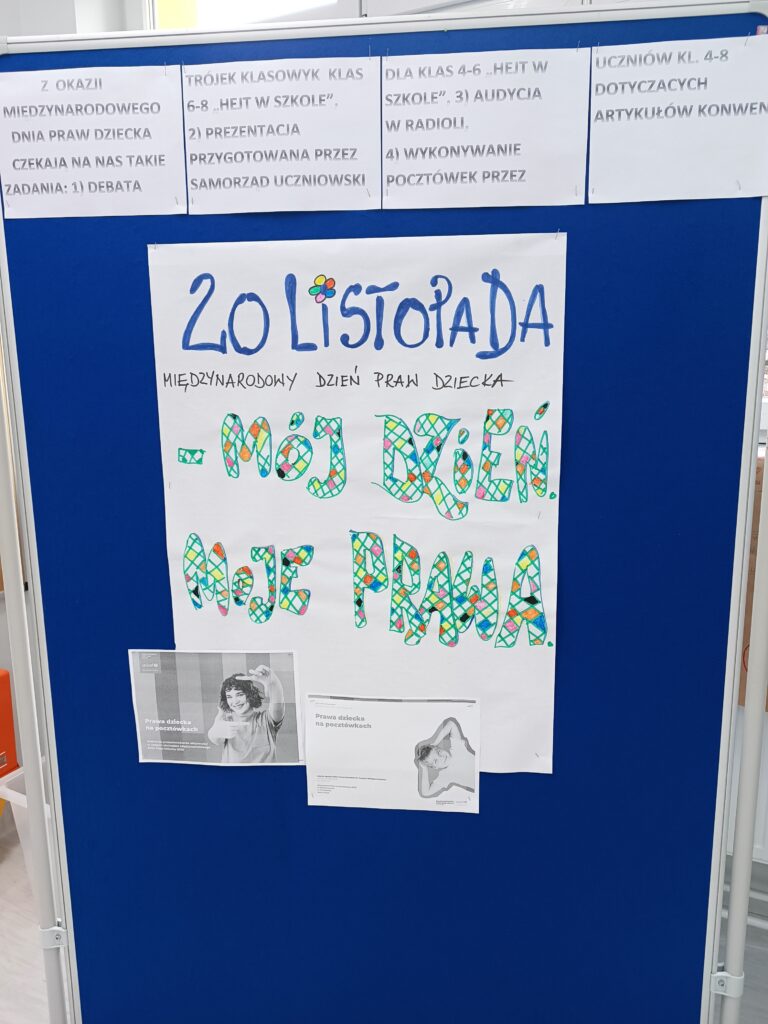 Dodać należy, że przeprowadziliśmy akcję pocztówkową z uczniami i uczennicami kl. 4-8 w ramach szkolnych obchodów Międzynarodowego Dnia Praw Dziecka. Tym samym przyłączyliśmy się do działań UNESCO.
