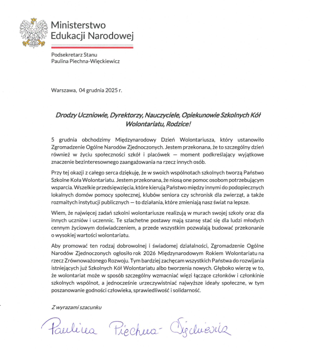 Z tej okazji przekazujemy List Pani Minister, Pauliny Piechny-Więckiewicz