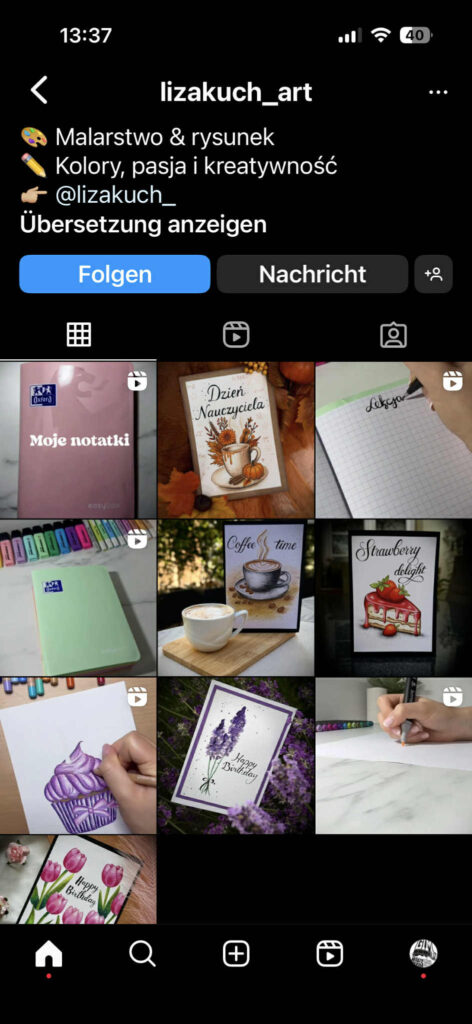 Jak widać na zdjęciach poniżej Liza ma nieprawdopodobne wyczucie estetyki i wspaniały talent. Jej prace możecie podziwiać na jej profilu Instagram, do którego dotrzecie skanując QR-kod na drzwiach sal lub klikając na link poniżej – zapraszamy do odwiedzenia jej stron – można podziwiać prace lub się po prostu zainspirować: