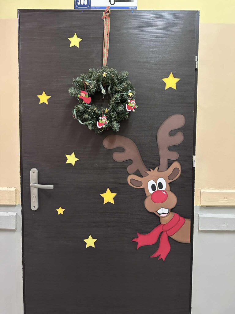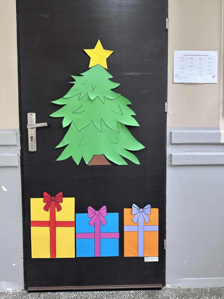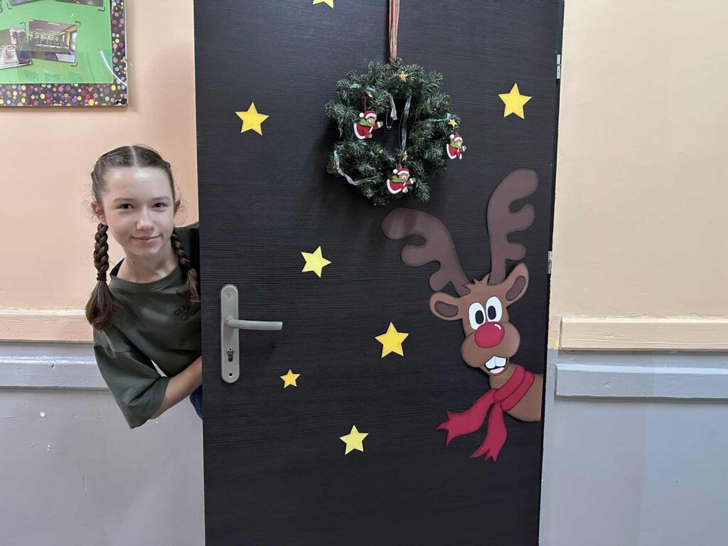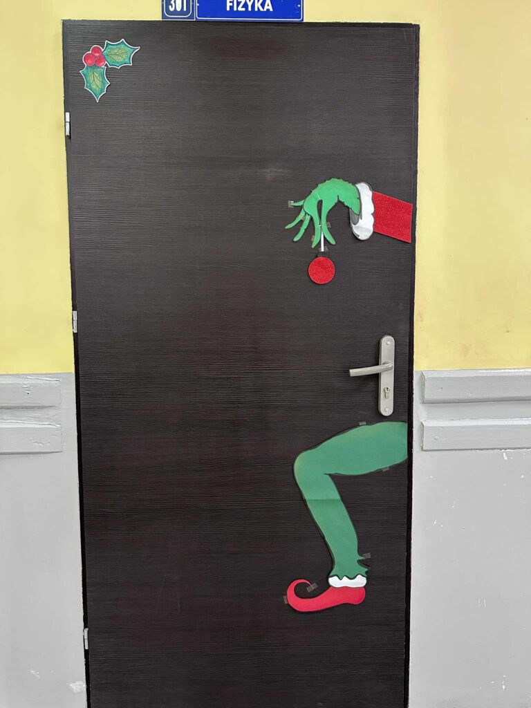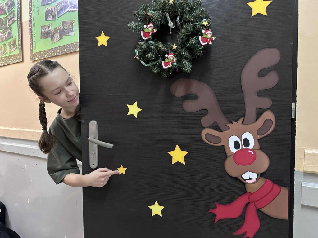 Uczennica klasy 7c Liza Kucharska wykonała świąteczną dekorację drzwi do sal lekcyjnych na II piętrze. Przygotowała własnoręcznie ozdoby świąteczne, takie jak wycinanki, elementy dekoracyjne z papieru oraz drobne akcenty nawiązujące do nadchodzących Świąt Bożego Narodzenia.