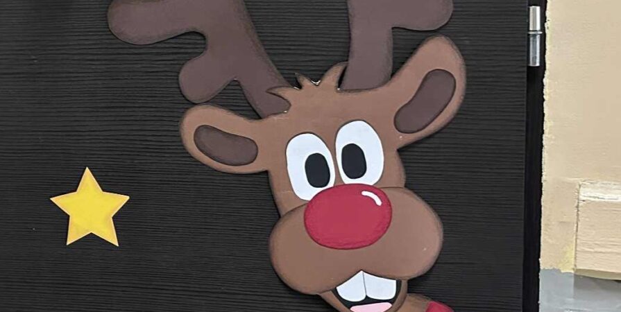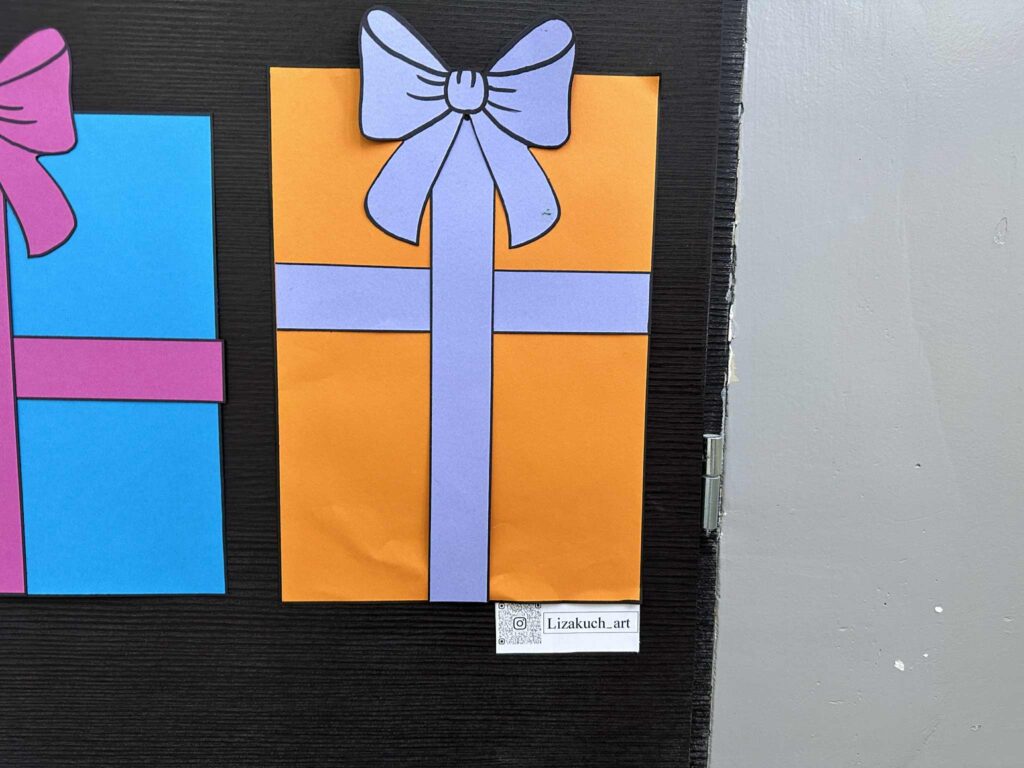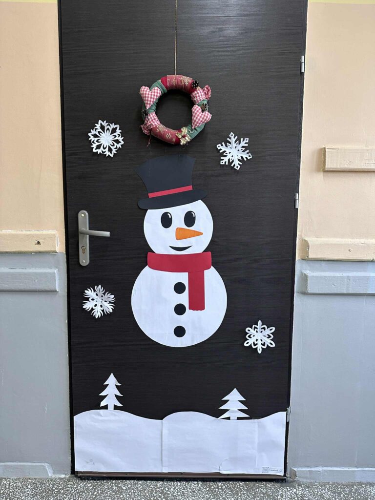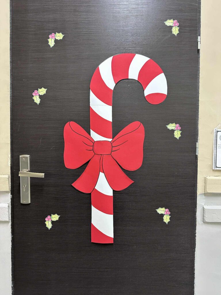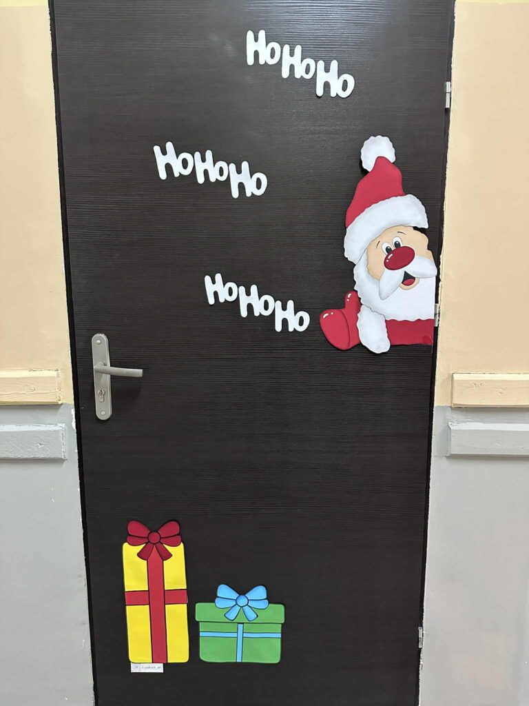 Uczennica klasy 7c Liza Kucharska wykonała świąteczną dekorację drzwi do sal lekcyjnych na II piętrze. Przygotowała własnoręcznie ozdoby świąteczne, takie jak wycinanki, elementy dekoracyjne z papieru oraz drobne akcenty nawiązujące do nadchodzących Świąt Bożego Narodzenia.