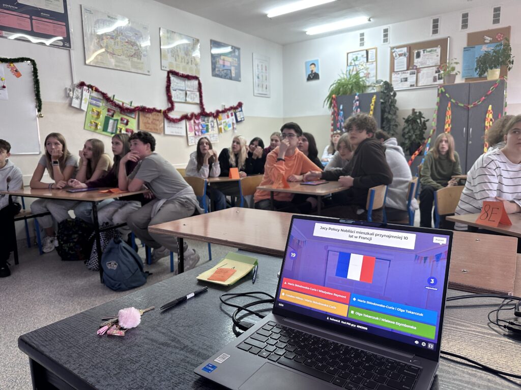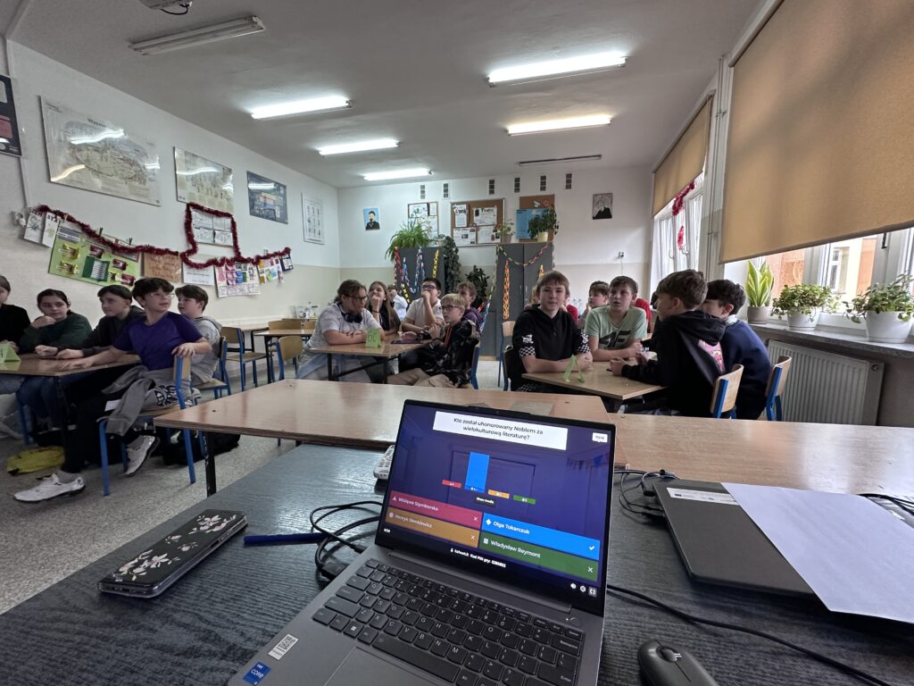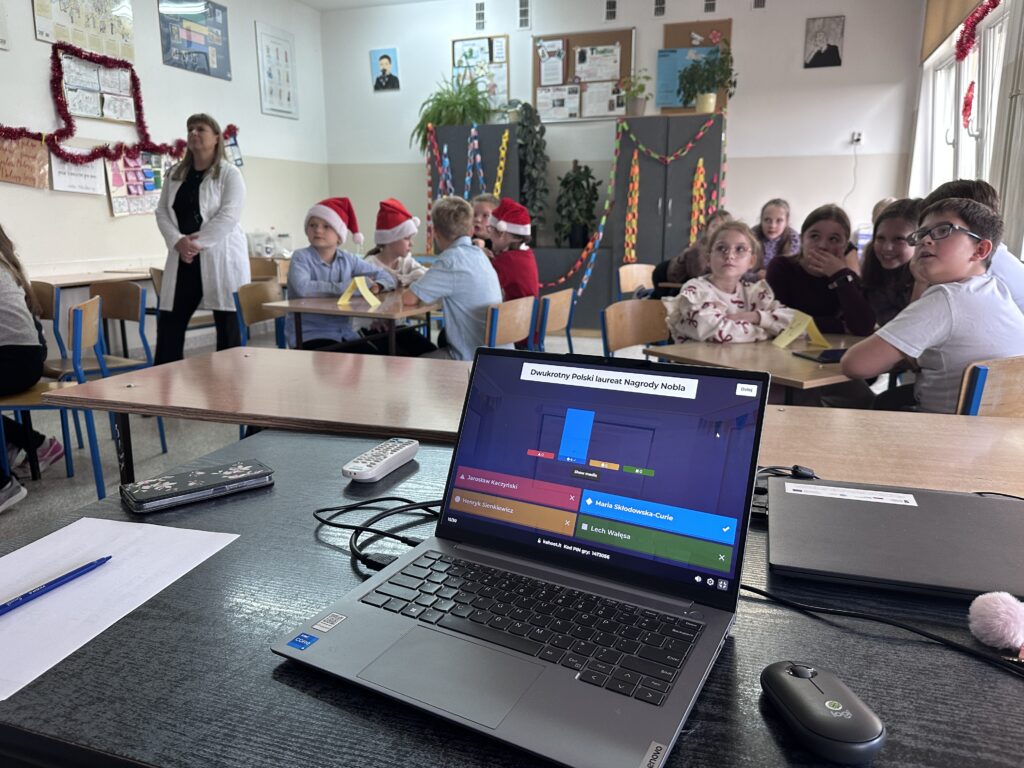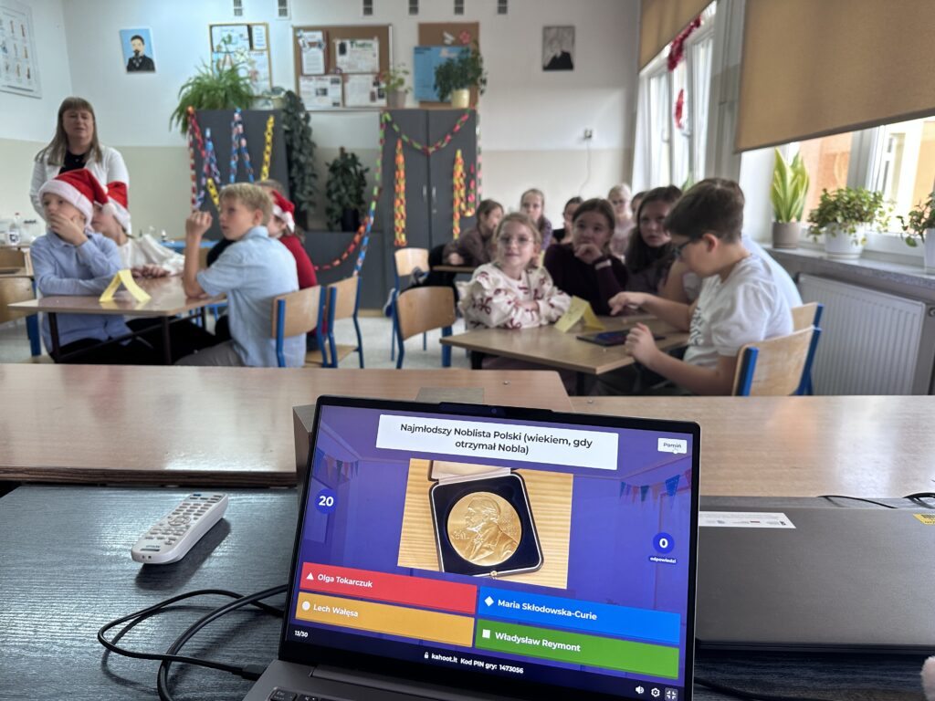 Szeroko wykorzystano narzędzia cyfrowe i internetowe, co jest zgodne z kierunkiem polityki oświatowej na rok szkolny 2025/2026 dotyczącej rozwijania kompetencji cyfrowych uczniów. Podczas rywalizacji wiedzy w aplikacji Kahoot najlepsze wyniki osiągnęły klasy 6, które wyróżniły się szybkim i poprawnym udzielaniem odpowiedzi. Najwięcej trudności sprawiło dopasowywanie cytatów do odpowiednich Noblistów.