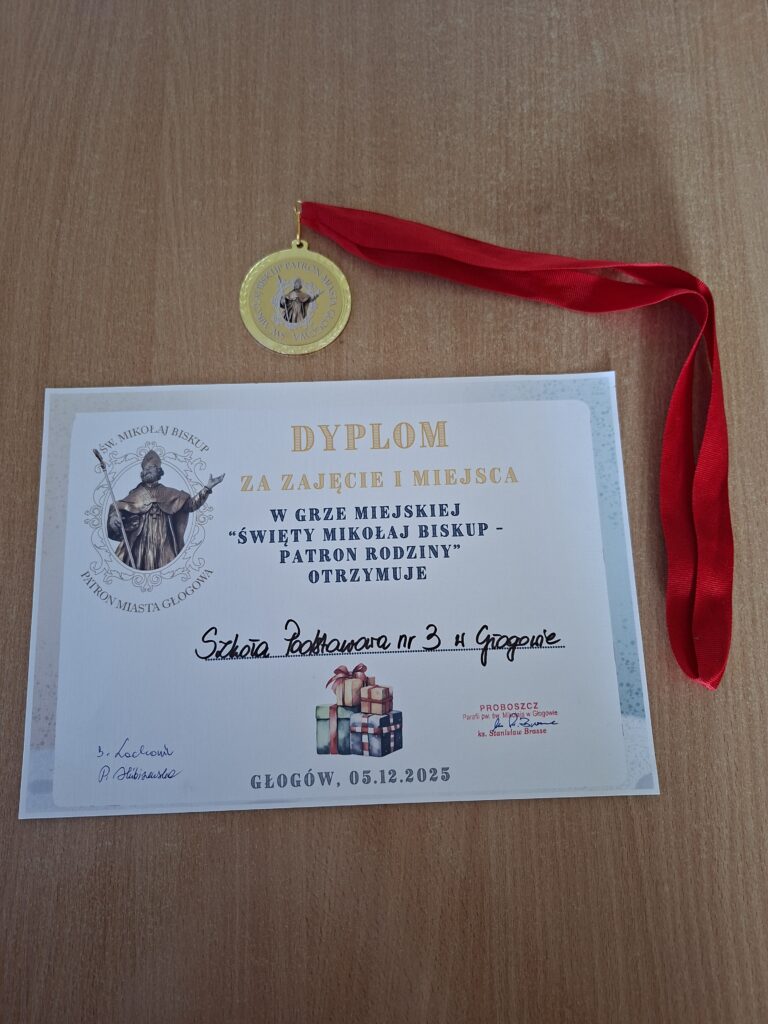 W dniu 05.12.2025 r. uczennice naszej szkoły Lena Łuczyńska, Alicja Ptak oraz Iga Sznajder z klasy 7bzdobyły 1. miejsce w miejskiej grze terenowej „Święty Mikołaj biskup – patron rodziny”, skierowanej do młodzieży klas VII i VIII szkół podstawowych oraz uczniów szkół ponadpodstawowych miasta Głogowa.