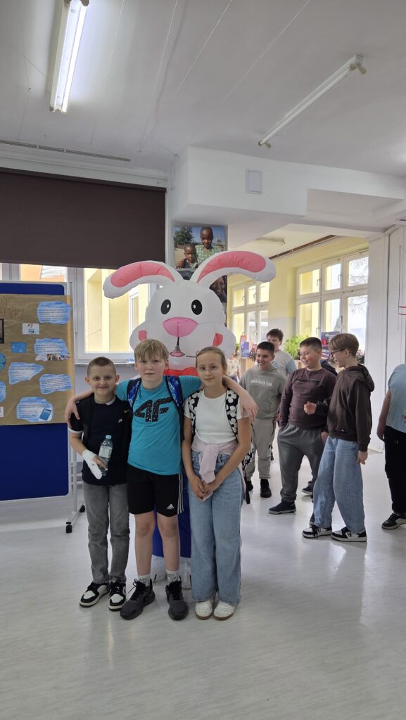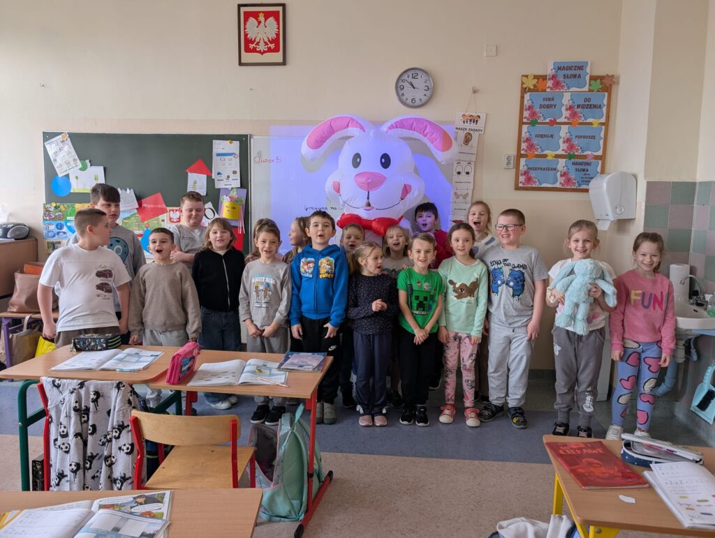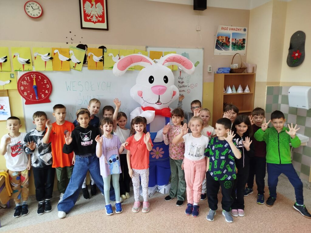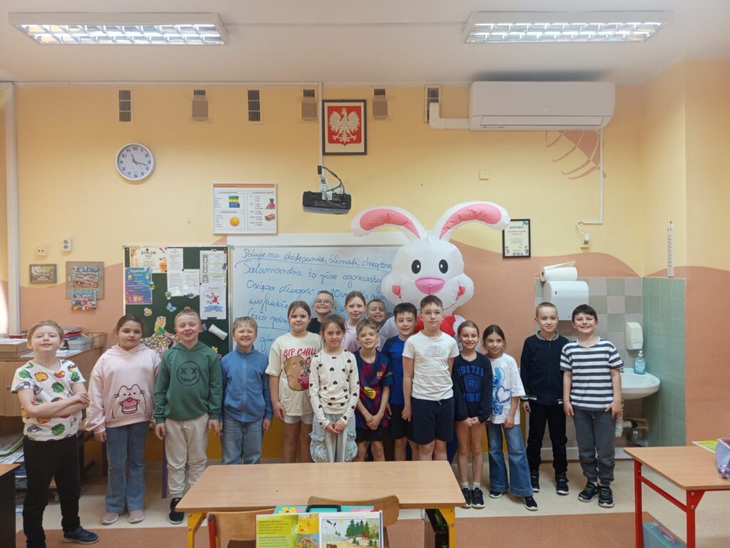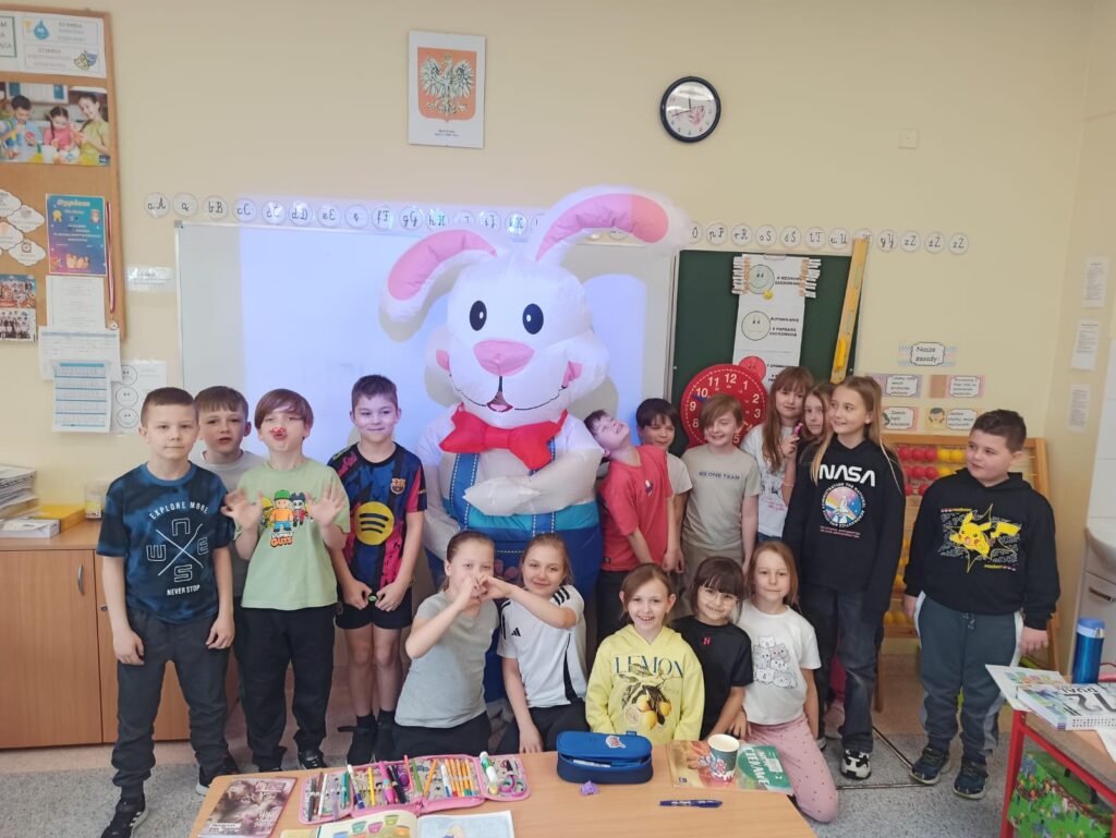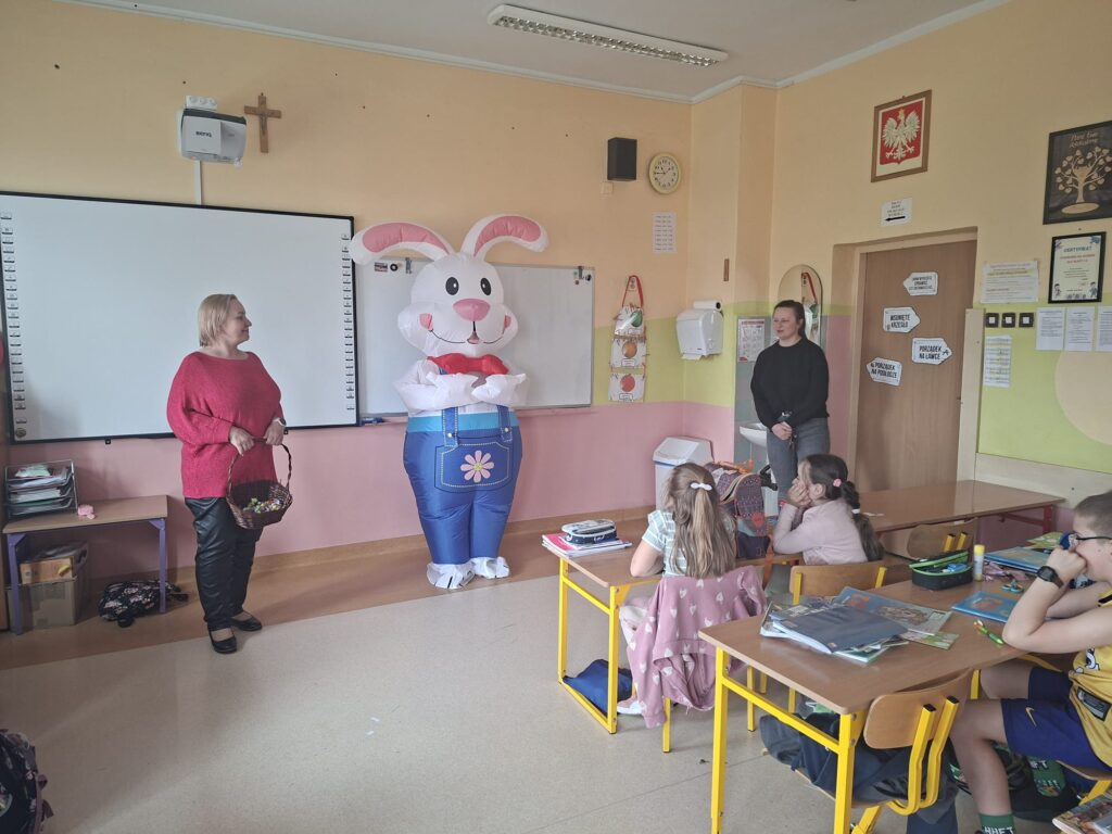 Tuż przed świętami wszystkie klasy 1-3 odwiedził królik wielkanocny, który wraz z Panią wicedyrektor i Panią Kamilą przypomniał uczniom o zasadach bezpieczeństwa podczas przerwy świątecznej. Zachęcał, aby w czasie wolnym bawić się bezpiecznie, uważać na drodze oraz słuchać opiekunów.