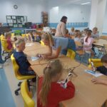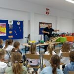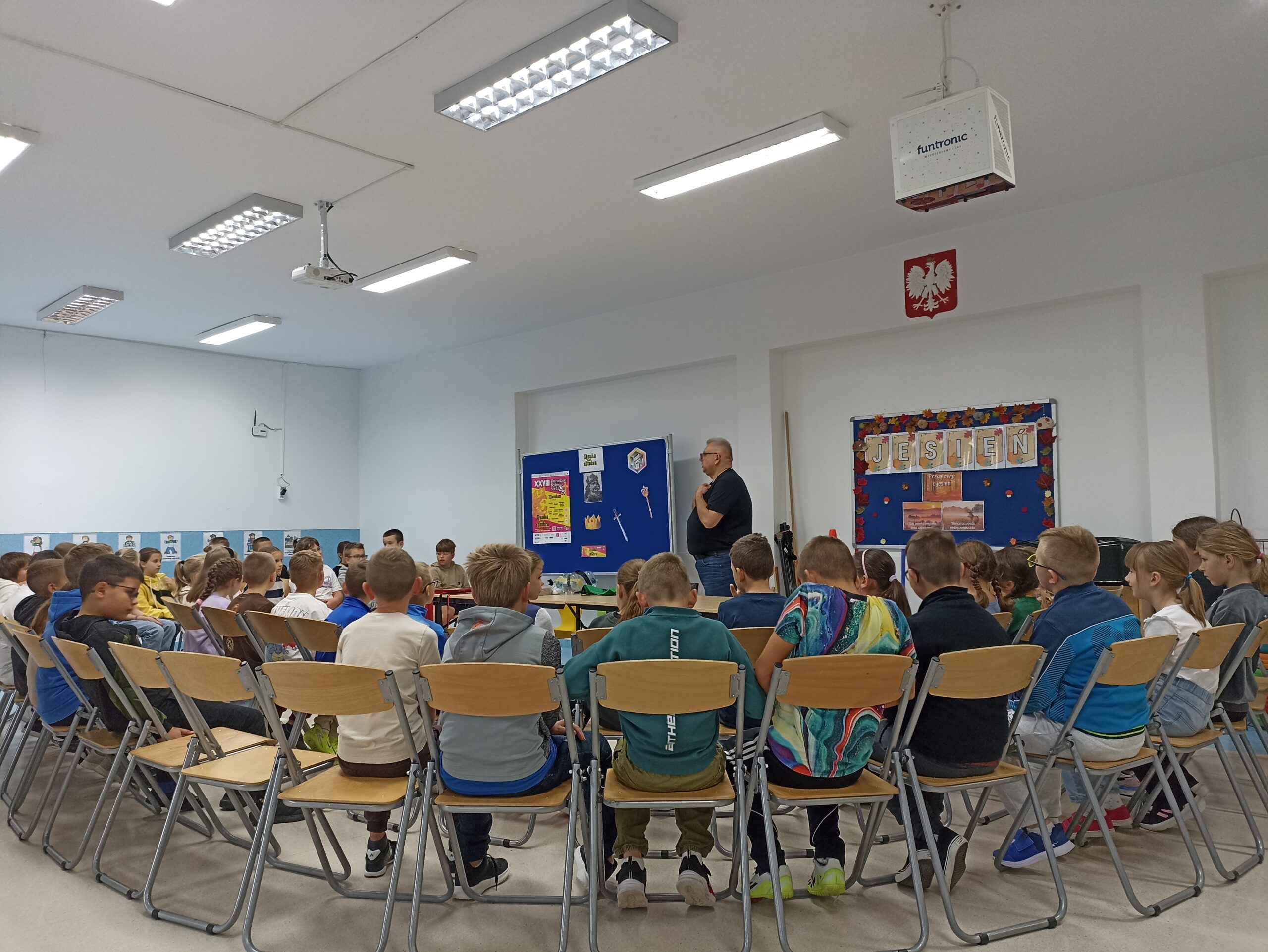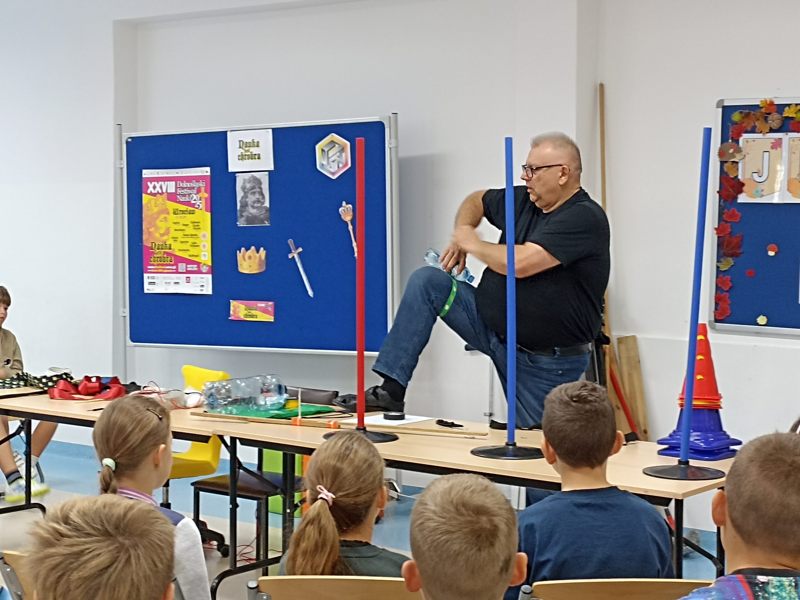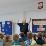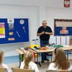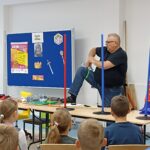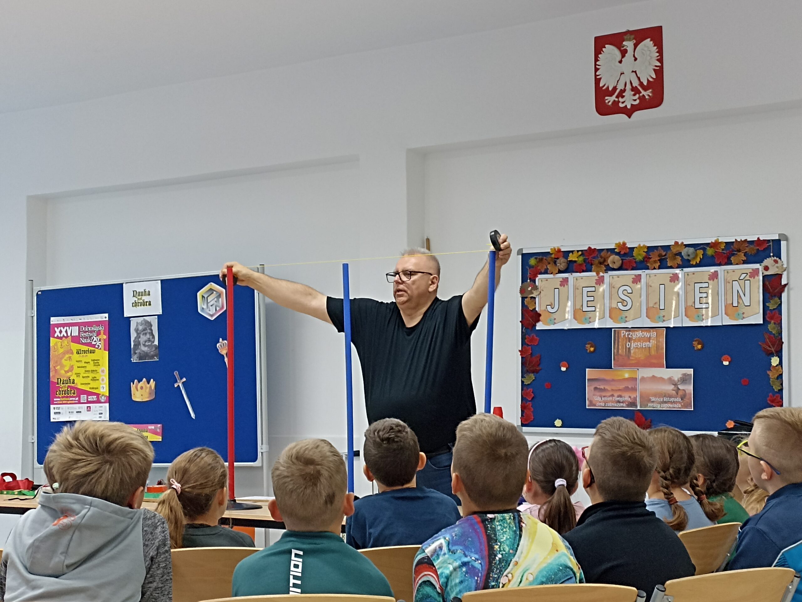 „Kij, deska, kółko, sznurek”. Zajęcia prowadził Pan Dyrektor Ernest Kłósek. Pan Dyrektor pokazał wiele przydatnych zastosowań prostych przedmiotów, takich jak kij, deska, kółko, sznurek. Niektóre zastosowania były oczywiste, inne wywoływały zdziwienie, a nawet zachwyt, bo przecież praktyczne umiejętności mogą się przydać w szkole, w domu, czy na wycieczce w trudnym terenie. Dzieci były zachwycone.
