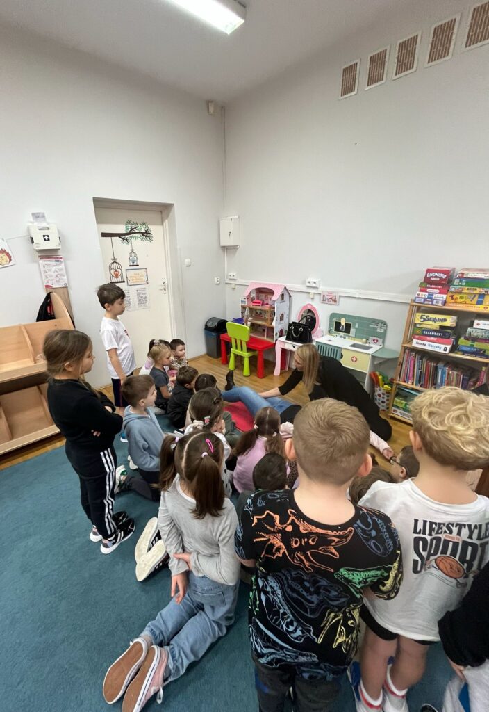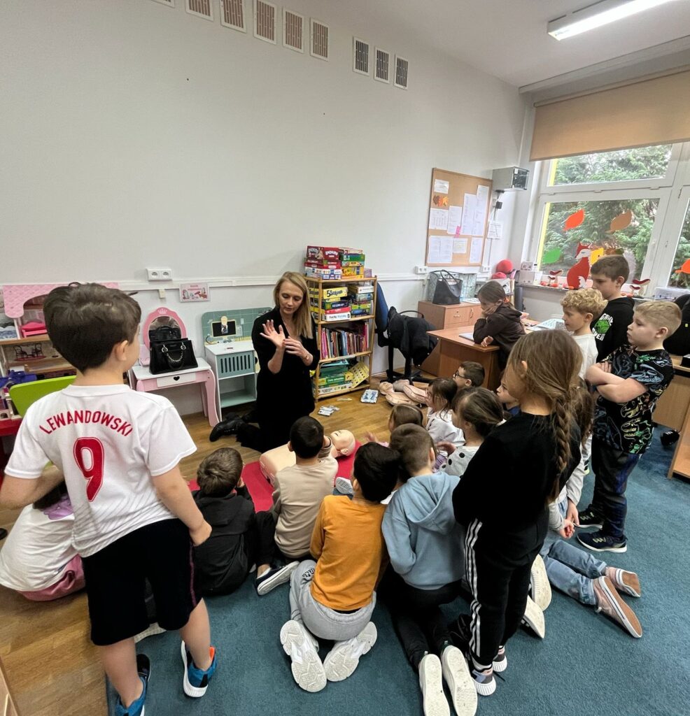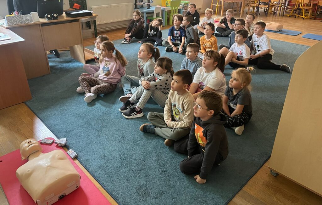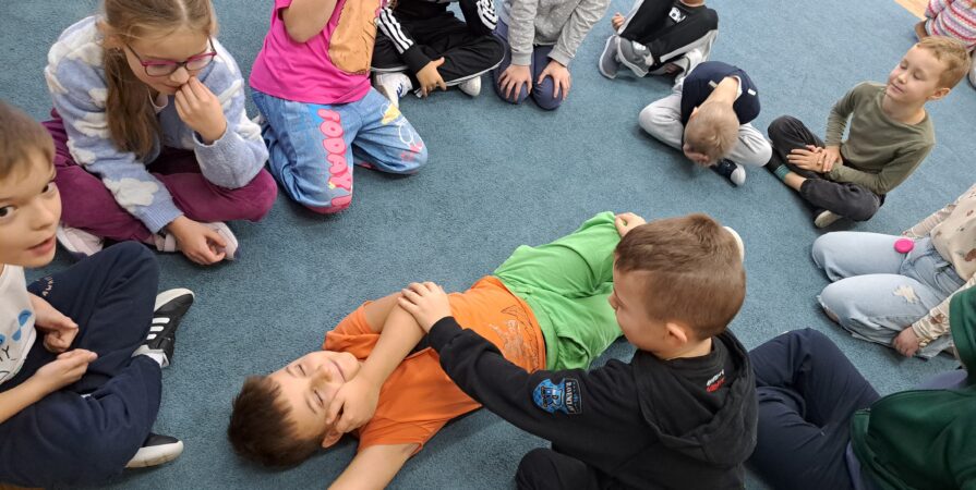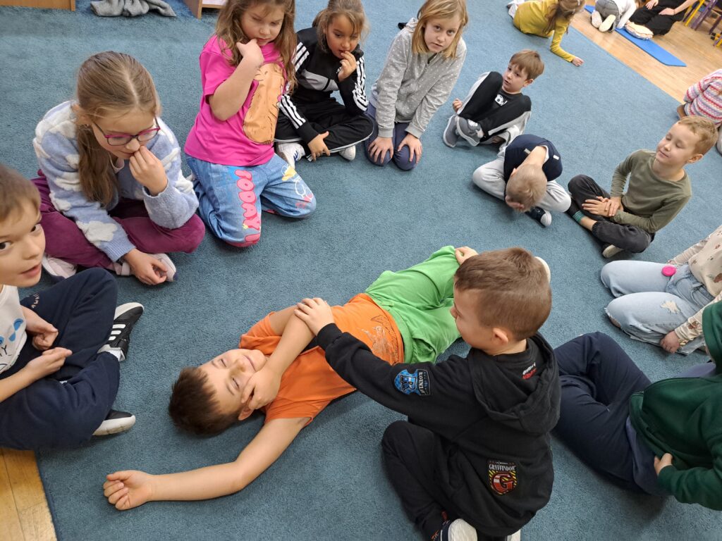 W dniu 27.11.2025 r. uczniowie z klasy 1a, 1b i 1c wzięli udział w praktycznych zajęciach z zakresu pierwszej pomocy przedmedycznej. Podczas spotkania dzieci uczyły się, jak prawidłowo oceniać stan poszkodowanego oraz w jaki sposób skutecznie wzywać specjalistyczną pomoc, przekazując najważniejsze informacje dyspozytorowi.