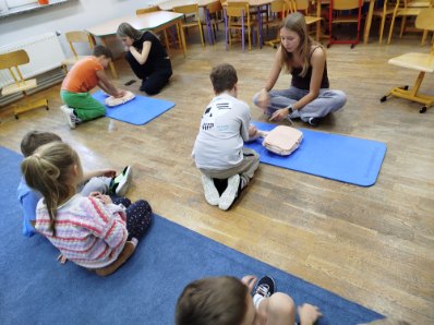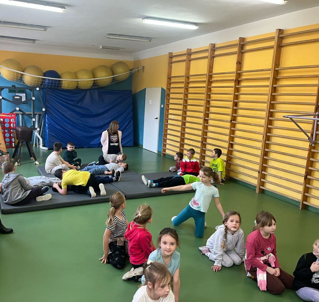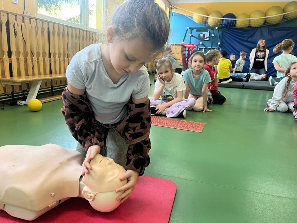 Pierwszoklasiści poznali również podstawowe zasady wykonywania resuscytacji krążeniowo-oddechowej oraz mieli okazję przećwiczyć układanie osoby nieprzytomnej w pozycji bocznej ustalonej. W warsztatach uczestniczyły także szkolne wolontariuszki, które pomagały uczniom w nauce udzielania pierwszej pomocy, wspierając ich podczas wykonywania poszczególnych ćwiczeń. Zajęcia odbyły się w formie praktycznej, dzięki czemu dzieci mogły zdobyć cenne umiejętności, które w przyszłości mogą pomóc w ratowaniu zdrowia i życia.