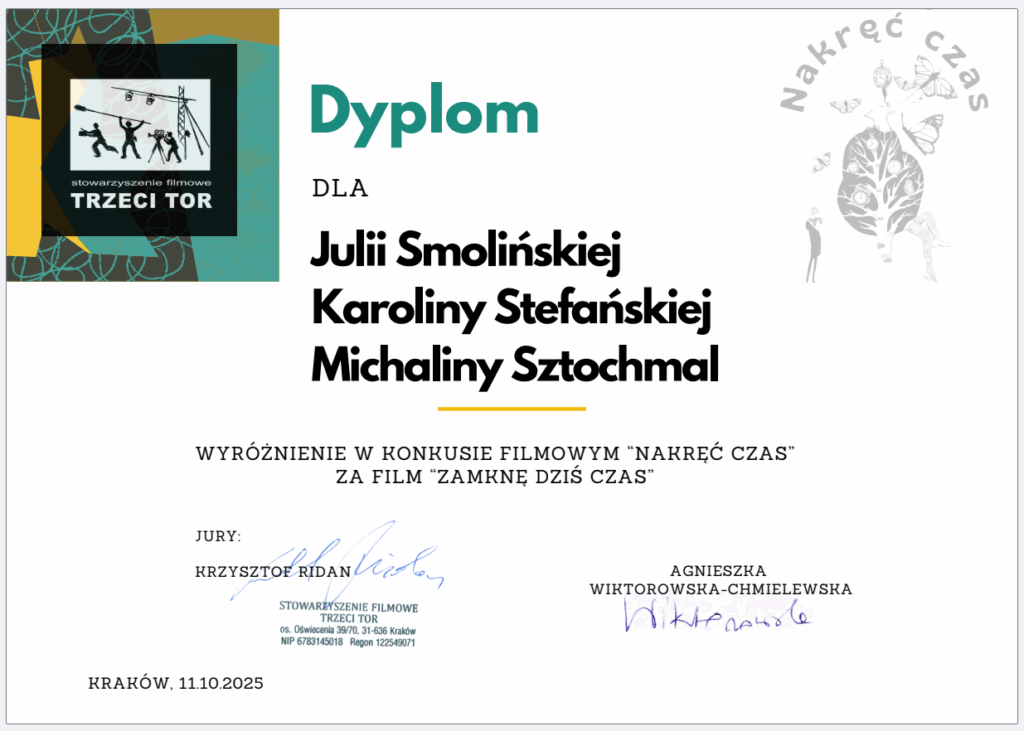 Miło nam poinformować, że film „Zamknę dziś” czas znalazł się wśród finalistów Ogólnopolskiego Konkursu Filmowego „Nakręć czas” i i otrzymał 1. wyróżnienie w tym konkursie.