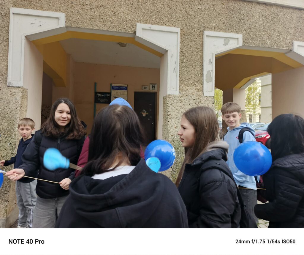 W trakcie marszu uczniowie rozdawali przechodniom niebieskie papierowe żarówki z
